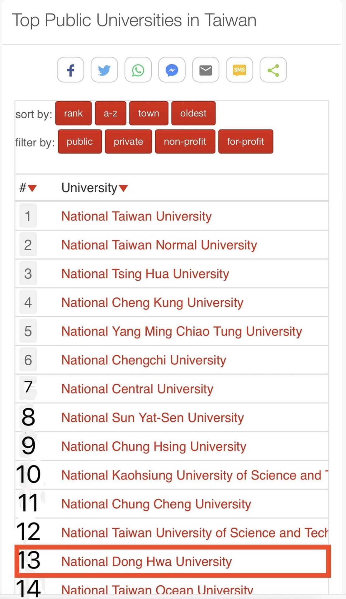 東華大學於uniRank臺灣公立大學排名第13名