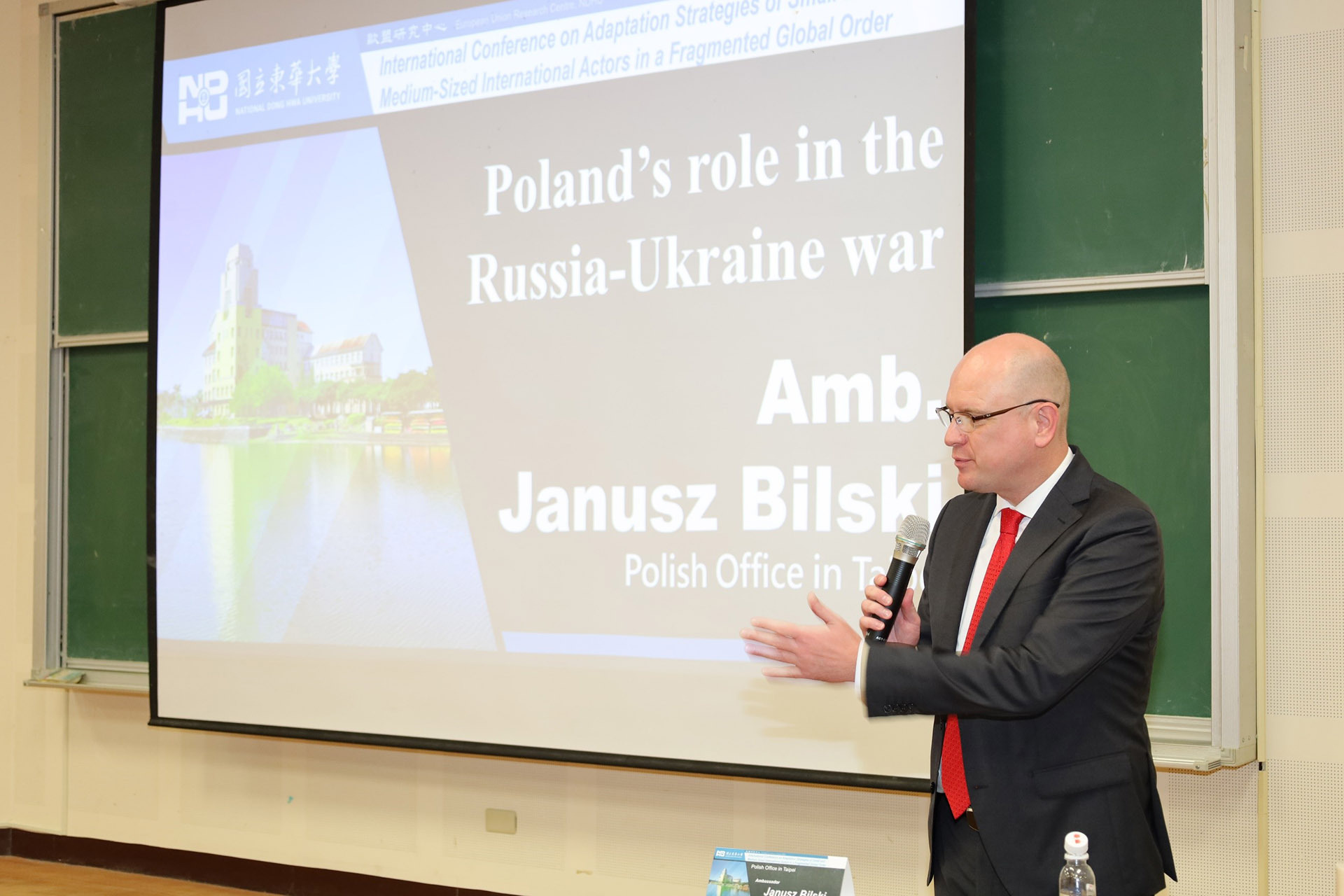 研討會特別邀請到張愛玲主任秘書代表大陸委員會出席,除表達歡迎國際學者來臺外,並分享當前兩岸關係現況。主題演講則是邀請波蘭駐臺辦事處Janusz Bilski代表,為與會學者及師生分享俄烏戰爭中波蘭的角色及作為,並邀請中興大學國際政治研究所的楊三億教授擔任與談回應。
