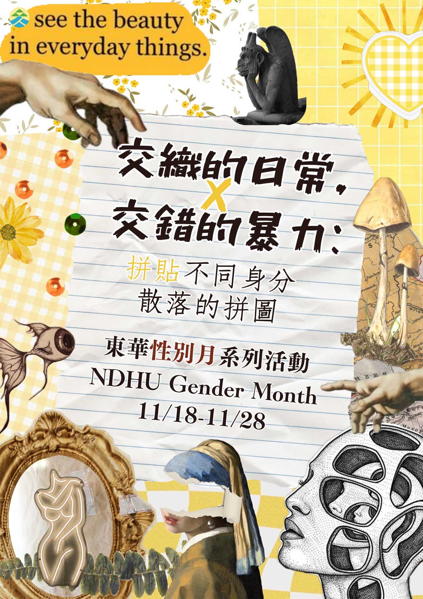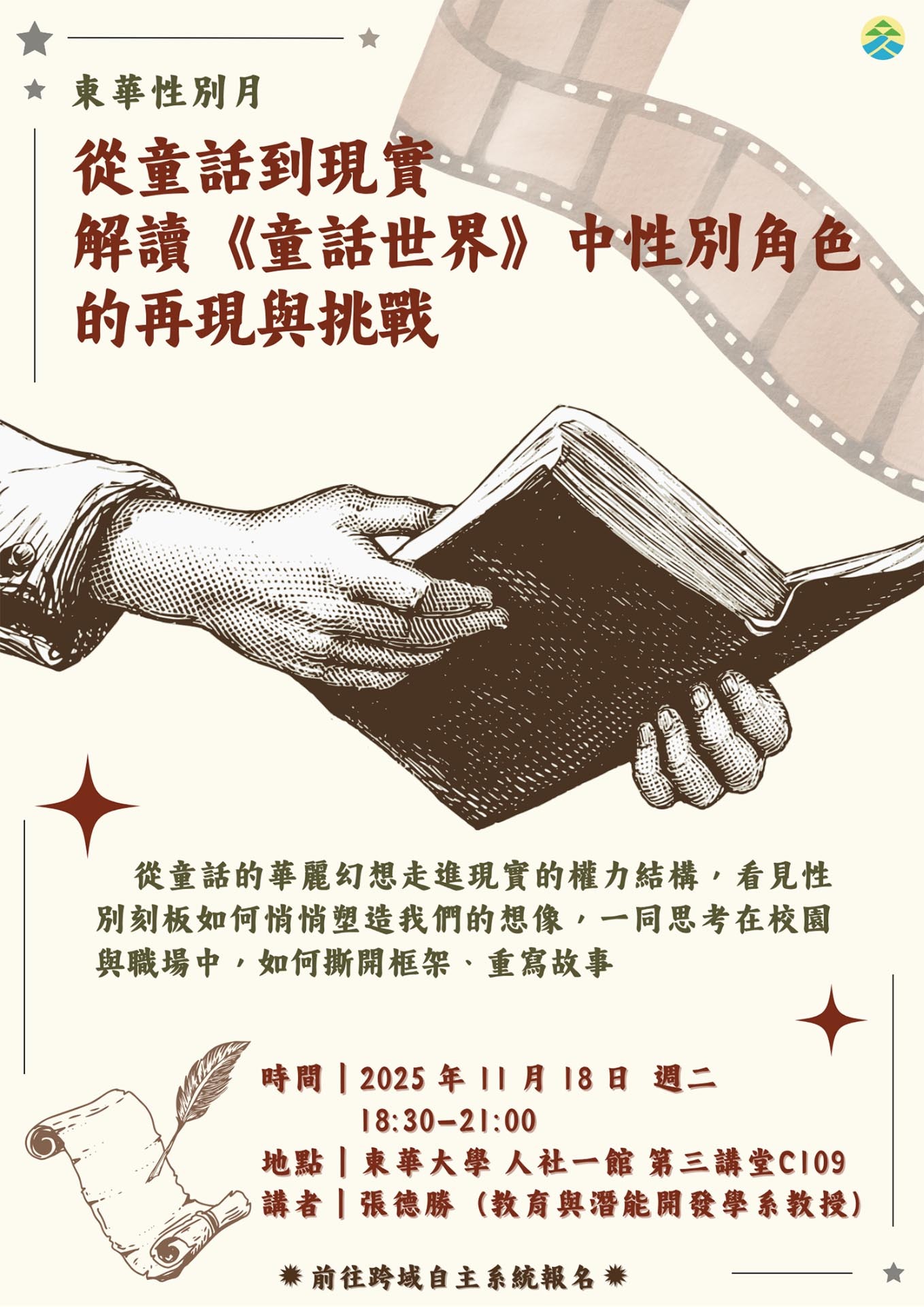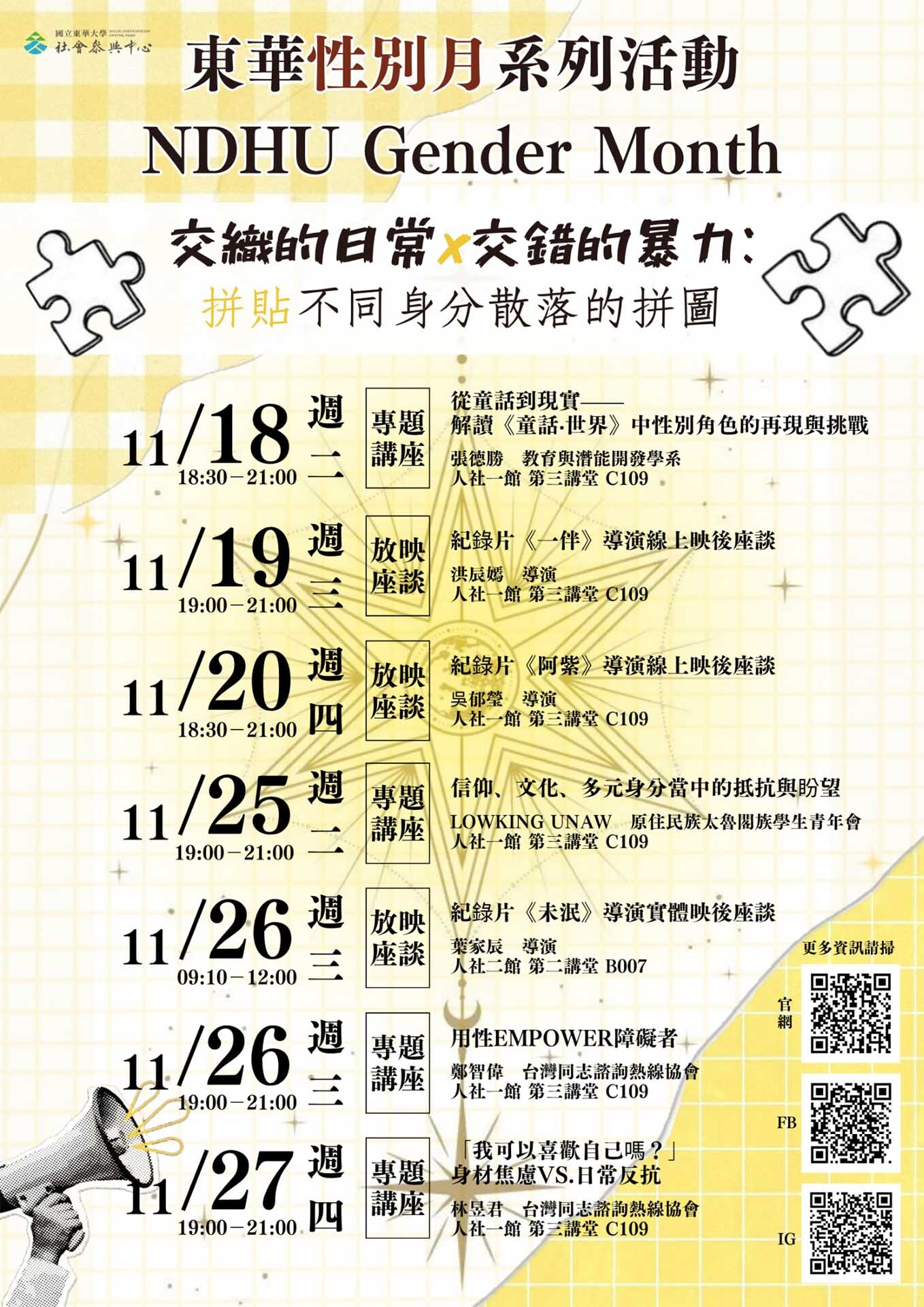國立東華大學於本學期正式成立性別微學程,為深化學生對性別、階級、族群和障礙等交織性的理解與討論,以及推廣性別微學程,社會參與中心主辦2025性別月系列活動,以「交織的日常X交錯的暴力:拼貼不同身分散落的拼圖」為核心主題,在校園展開為期兩週的專題講座與放映座談活動,邀集了校內外講師與紀錄片導演進行性別議題的分享。此次活動獲得東華大學秘書室與臺灣民主基金會的經費補助,首場活動於11月18日舉辦,由教育與潛能開發學系張德勝教授擔任講者,向同學解析電影《童話.世界》內含的權勢性侵議題,吸引近70位同學參與。