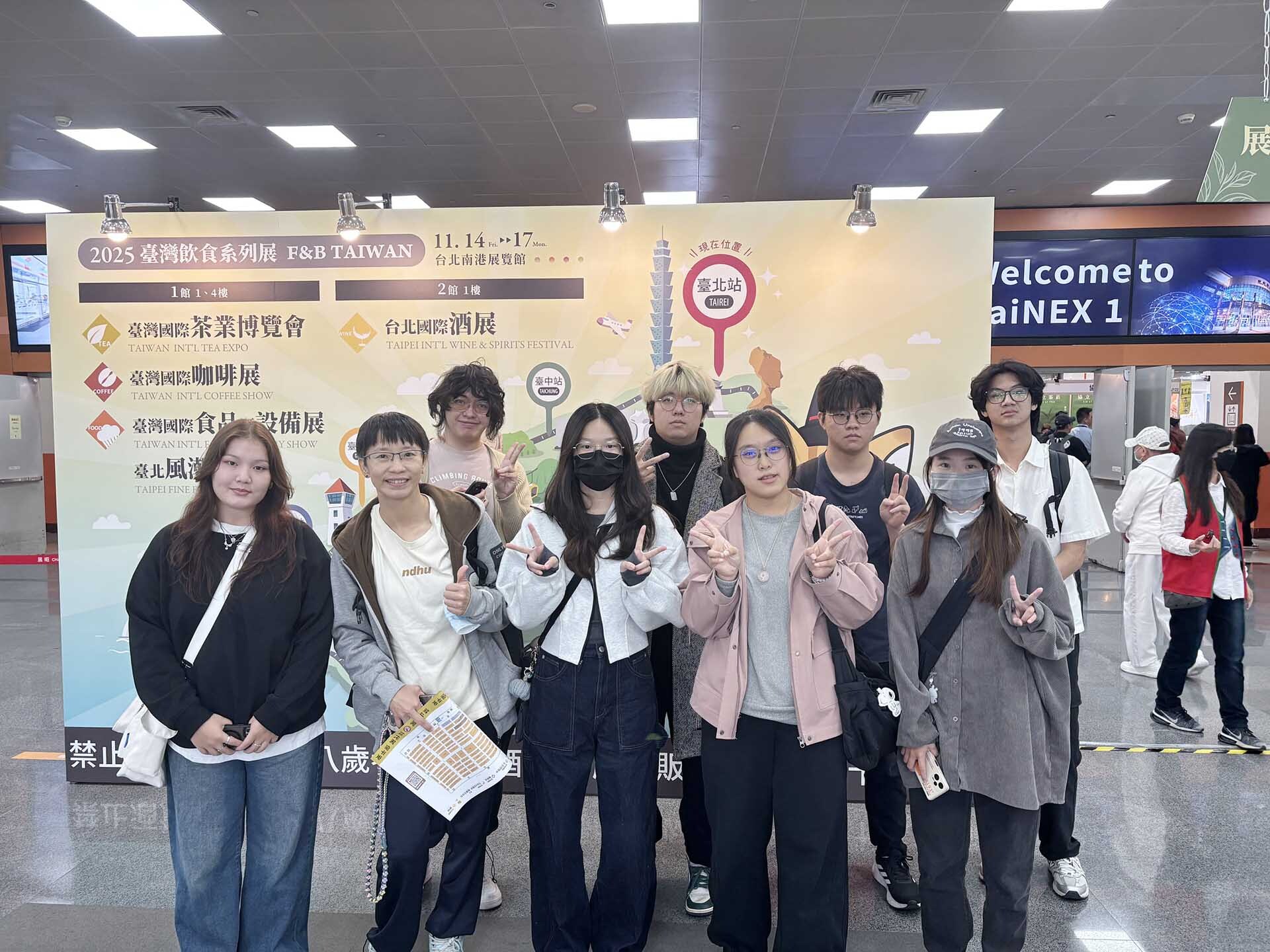 接著,課程的腳步由在地邁向更大的城市舞台,第二階段觀展工作坊於11月15月前往臺北南港展覽館參訪「2025台灣飲食系列展F&B Taiwan」,學生聚焦於「茶葉」與「咖啡」展區中與國內外品牌攤商以英語互動,瞭解國際行銷、產品特色與產業發展趨勢;過程中也觀察到品牌積極融入永續理念,如減碳流程、環保包材與綠色供應鏈,進一步思考飲食文化、國際市場與永續責任之間的連結。
