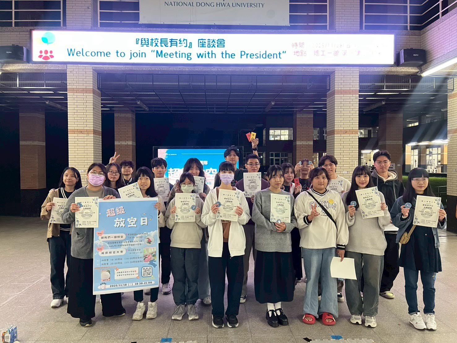 本次活動的圓滿成功,背後彰顯的是東華大學執行深耕計畫分項6策略的深層意涵,不同於傳統由行政單位主辦活動,此類組織強調「由學生主導,校方輔導」,目的在提供全校學生無酒精、可負擔且高品質的文化娛樂體驗。本次「超級放空日」即是運用夜間時段辦理的主題式活動,符合「NDHU LATE NIGHT」的概念。從活動發想、策劃到執行,全數由學生自主創意發揮,學校則退居幕後提供資源支持,讓學生在籌辦過程中實踐「做中學、學中做」,透過具體的執行經驗與檢核反思,引導學生發展出課堂外的實戰能力。