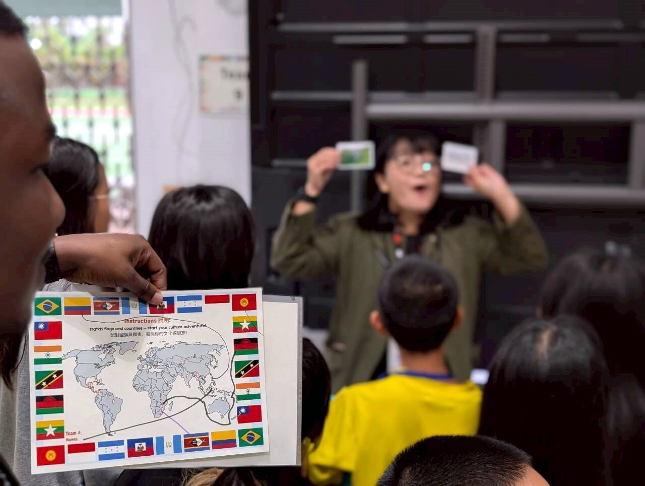 在沉浸式的文化關卡設計中,營隊將各國文化素養深度融入英語學習,讓孩子在節奏與律動中習得跨國知識。例如印度關卡「Kit-Kit」記憶大挑戰,便巧妙結合當地類似跳格子的傳統童年遊戲,讓學童在方格間躍動避開虛擬熔岩,同時練習「Taj Mahal」等地標詞彙,達成身體協調與認知記憶的平衡。印尼關卡則轉向地景探索,引導學生認識壯闊的湖泊「Lake Toba」與著名的「Mount Bromo」火山,建立紮實的地理英語詞彙。此外,關卡中網羅各國特色動物,令孩子驚奇不斷,他們不僅認識最受歡迎的巴西明星動物「卡皮巴拉(Capybara,水豚)」,也認識馬拉威草原上的「高角羚羊(Impala)」,在強化英語字彙量的同時,也啟發對生物多樣性的關懷。宏都拉斯關卡則呈現繽紛的文化風情,透過介紹盛大的節慶(Carnival)與國鳥「紅色金剛鸚鵡(Scarlet Macaw)」,提升學生的跨文化敏銳度。活動尾聲,團隊準備充滿象徵意義的禮物,如代表祝福與象徵友誼的瓜地馬拉手鍊、巴西國民汽水「瓜拿納(Guaraná)」,以及各國國旗地圖鑰匙圈,讓學童對異國文化產生具體的感官連結。