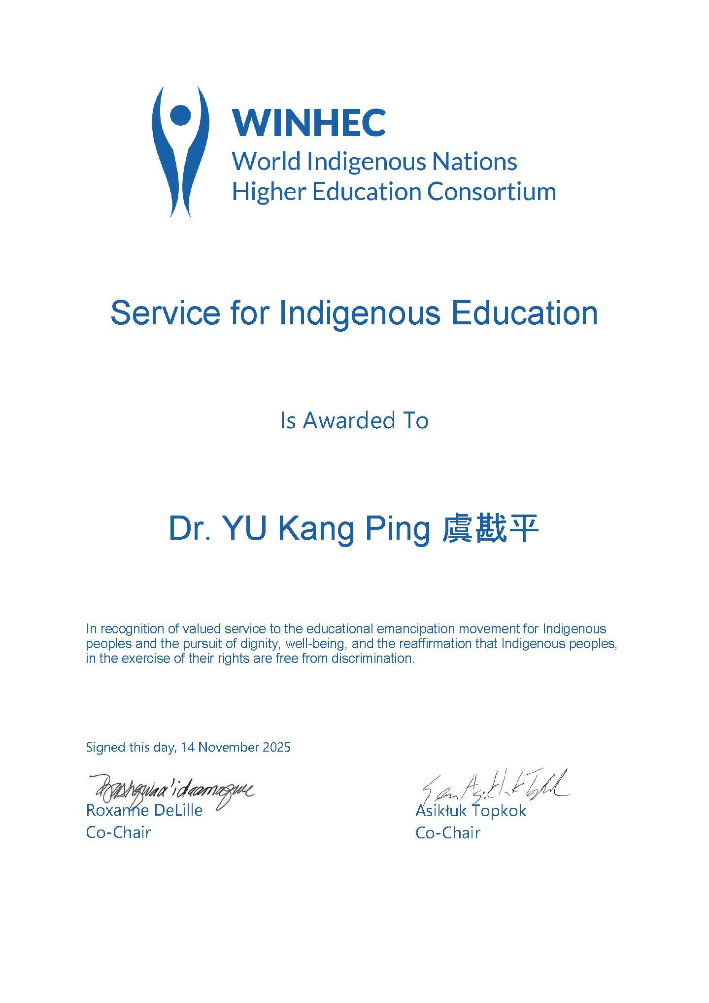 Bavaragh Dagalomai謝若蘭主任表示,虞戡平導演此次獲得WINHEC「原住民族教育服務獎」,不僅是對其藝術成就的肯定,更是對其長年以影像實踐原住民族教育服務的高度認可。她指出:「虞導並不是以『為原住民族做事』的姿態進入部落,而是選擇與族人同行,尊重部落自身的知識體系與文化節奏,讓影像成為族人自我表述與世代傳承的工具。」這樣的實踐,正是原住民族教育所強調的文化主體性與知識自主。