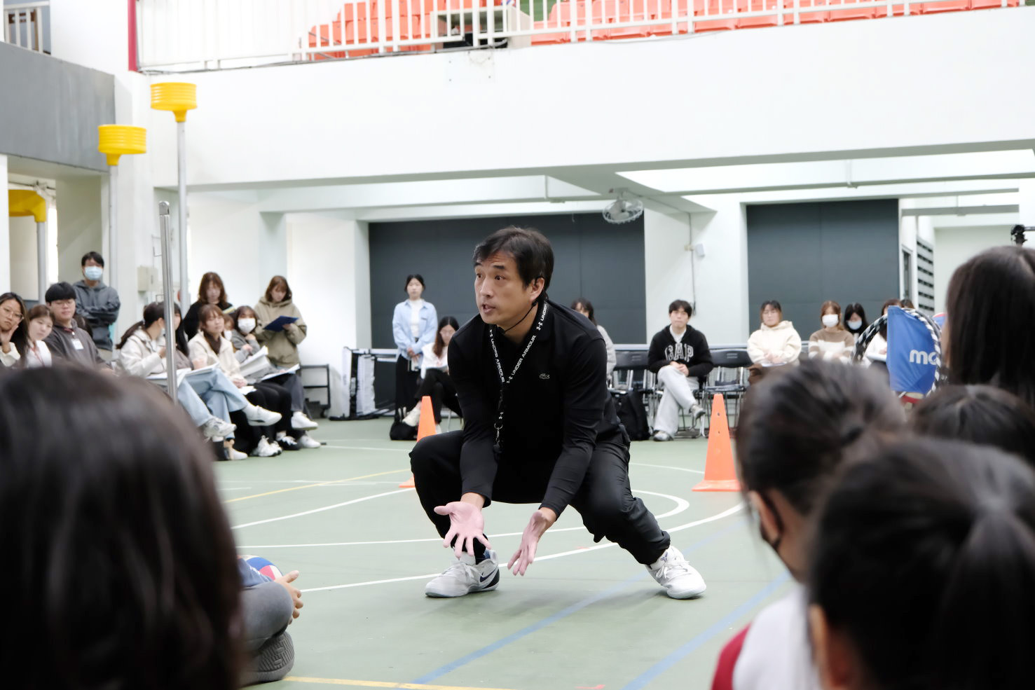 在教學過程中,教師融入簡單的英語指令與運動詞彙,例如「Pass the ball」、「Catch the ball」、「Eyes on ball」、「Stay low」與「Bend my knee」,讓學生在運動情境中自然理解英語語意。學生透過兩人一組的傳球練習與團隊合作任務,在實際操作中同時學習運動技能與語言表達。