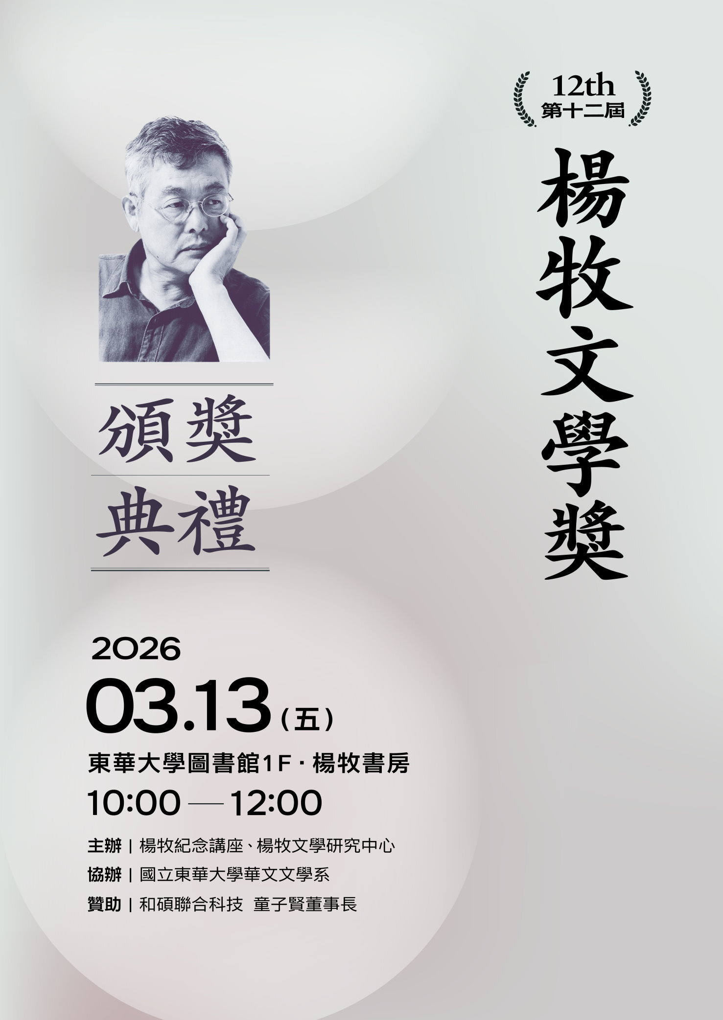 2026年3月13日,適逢詩人楊牧辭世六週年,第十二屆楊牧文學獎頒獎典禮於國立東華大學楊牧書房舉行。在初春的東華校園裡,師長、作家、研究者與青年創作者齊聚一堂,在追思與祝福交織的氛圍中,共同見證文學薪火的延續。